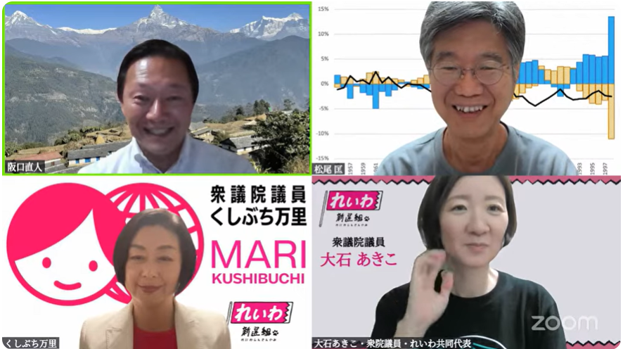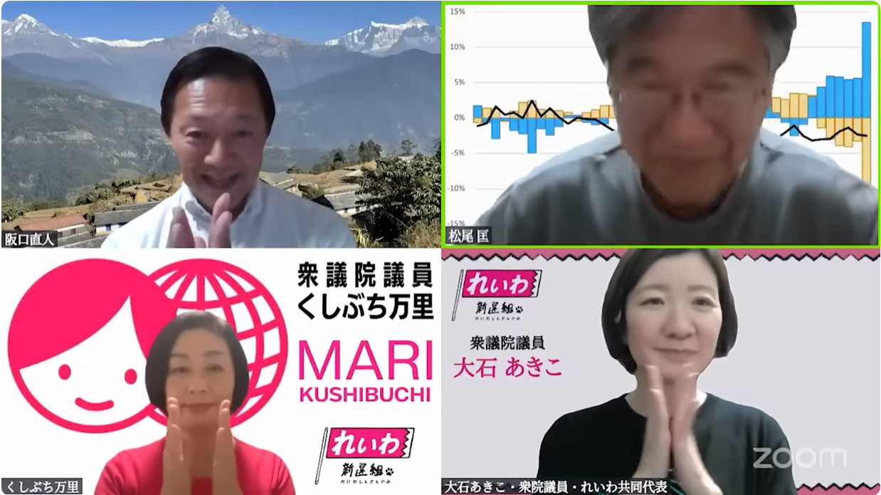 全国の皆さん、こんばんは。いよいよ来週から参議院選挙。今月の講師はどうしても松尾先生にお願いしたくて、ようやく今日がその日となり、大変楽しみにしていました。積極財政バッシングへの応え方は、永田町の議員全員に聞かせたいほどの内容。代表が、合同記者会見で“生きるための闘い”と位置付けて、参議院選挙への決意をマスコミにもお話しました。みんなでより賢くなって、選挙を迎え撃ちたいと思います。松尾さん、今日はよろしくお願いします。