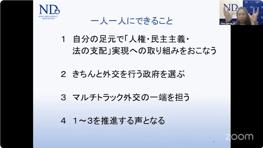 今回の勉強会では、新外交イニシアティブ(ND)代表で弁護士の猿田佐世氏が登場。