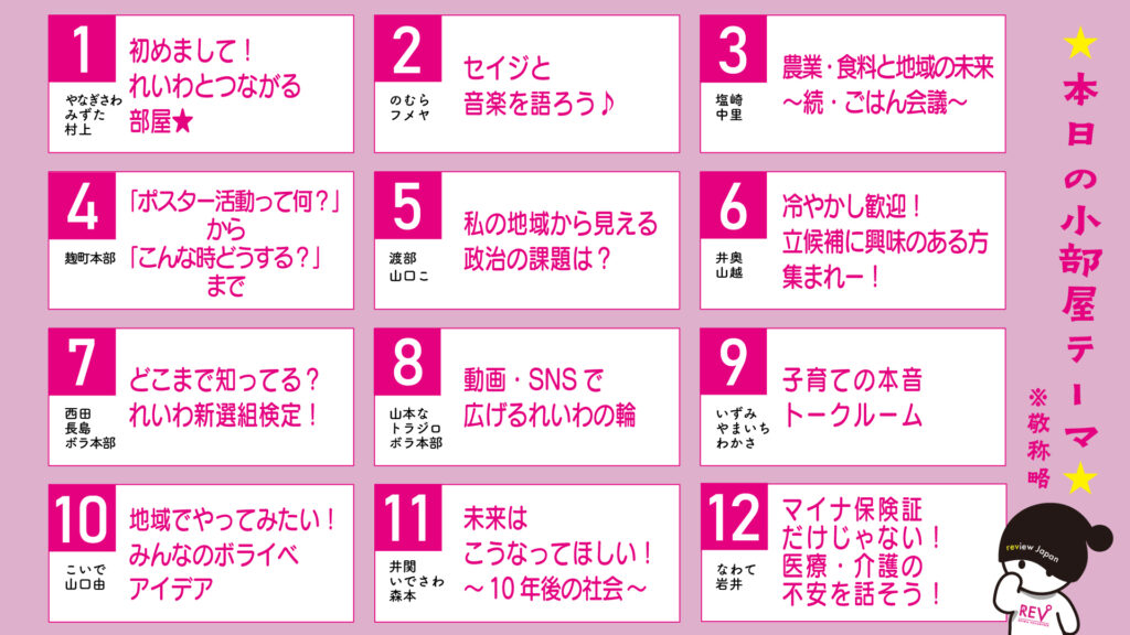 念願の初参加でした。「なるほど、こういう雰囲気か〜」というれいわらしい自由さを感じました。小部屋がたくさんあってどれも聞いてみたいテーマばかりで迷いますね。小部屋移動の際に少しトラブルもあったみたいですが、一度参加してみればハードルは下がるなと感じました。